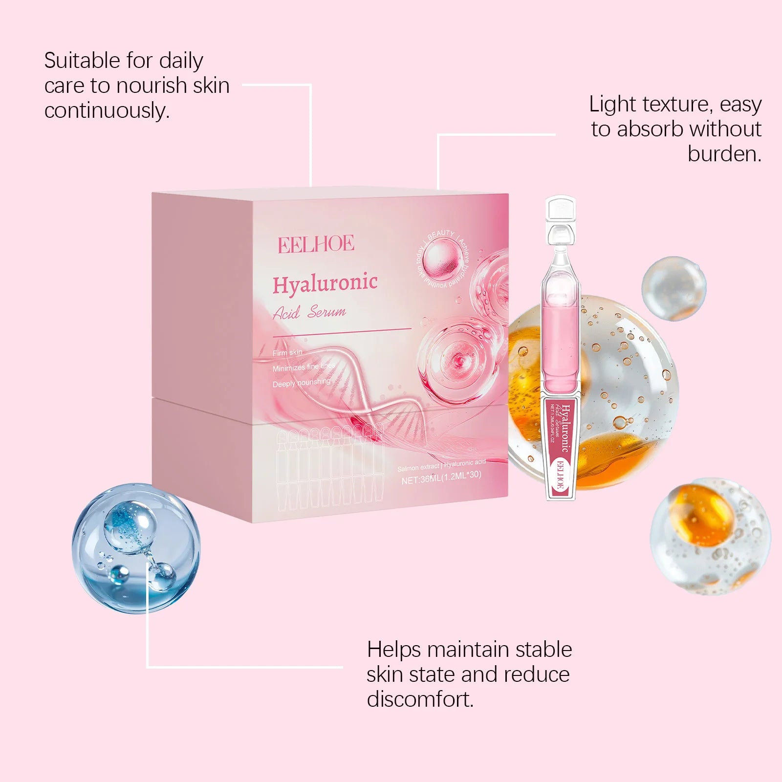 1. Reduce Fine Lines: Our Hyaluronic Acid Ampoule Essence is specifically designed to effectively reduce fine lines, promoting a youthful and rejuvenated appearance for your skin.